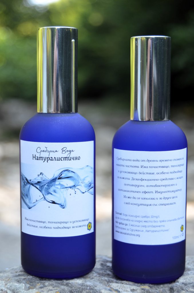Сребърната Вода Натуралистично се споделя в 100 мл. стъклени шишенца бутилирани специално за Сдружение “Натуралистично”, които могат да се преизползват многократно, по този начин чрез по-екологични материали се спомага за намаляването на въглеродния отпечатък и пластмасовото замърсяване. Сто милилитровите матови сини шишенца подсигуряват сребърната вода да запази своите свойства и качества, а спрей пулверизатора позволява ефирно впръскване на водата, носене в чанта и раничка в ежедневието ни, както и транспортиране в ръчен багаж при самолетни полети. Предстои бутилиране и в по-големи обеми.